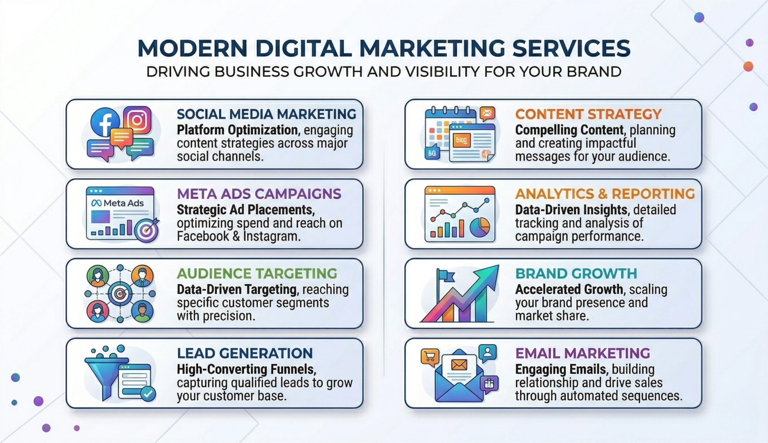 From Meta Ads on Facebook and Instagram to advanced audience targeting, creative ad design, and continuous performance optimization, we ensure your campaigns achieve maximum ROI. Our approach combines data-driven insights with creative execution to capture attention and drive engagement.