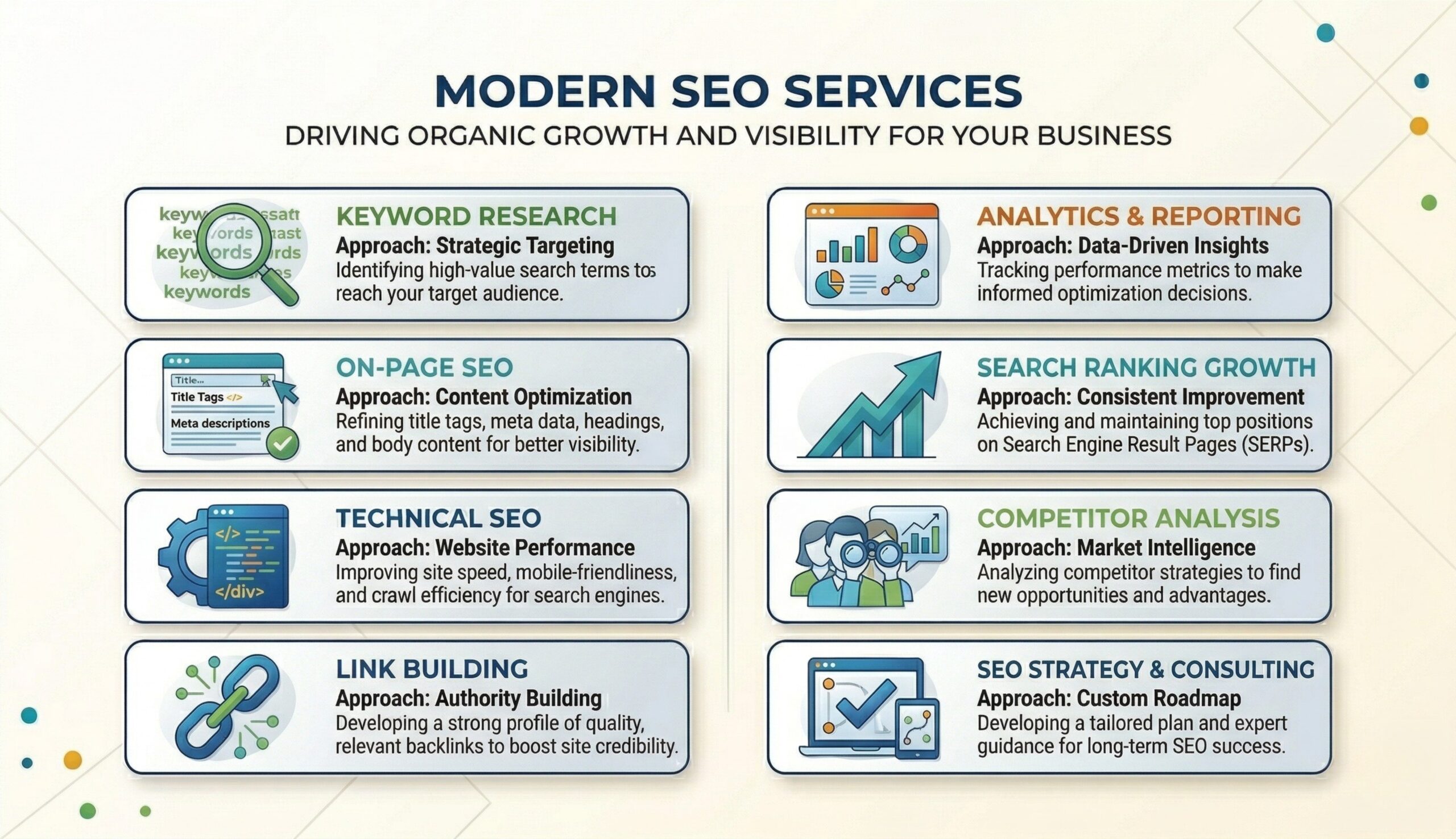 By combining technical SEO, on-page optimization, and off-page strategies, we create a strong digital foundation that helps your website grow organically and consistently over time.